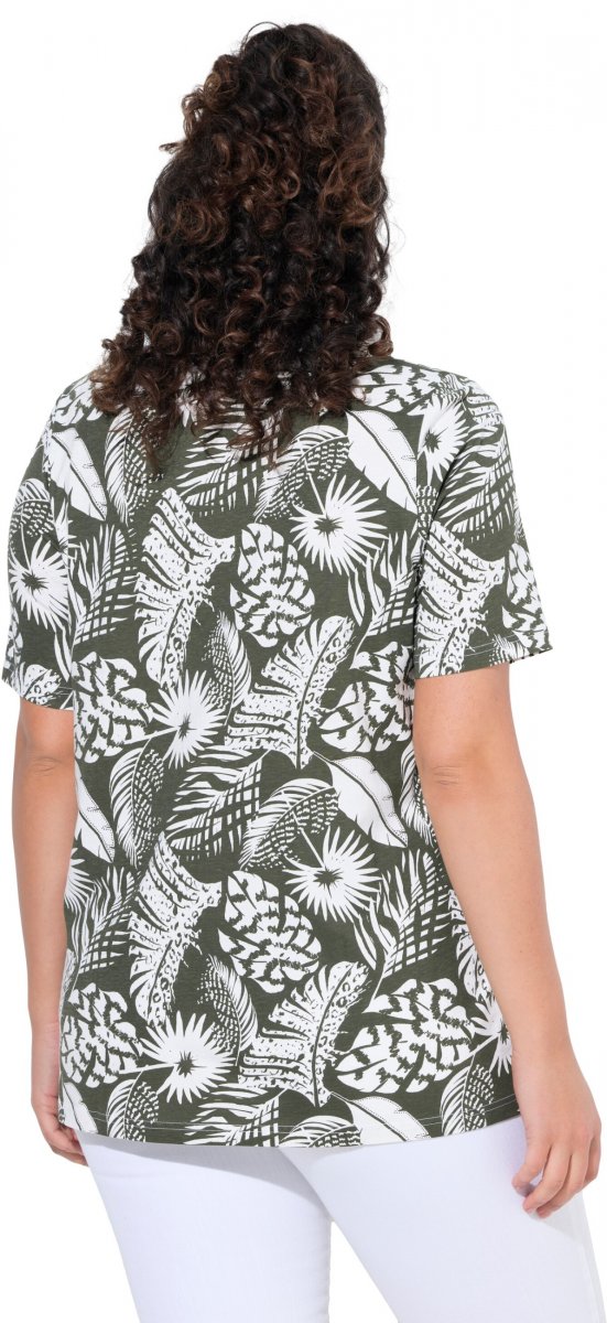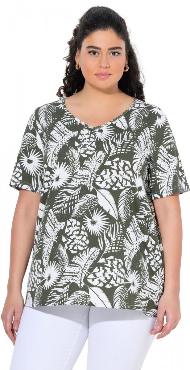 Größen-Ratgeber - Ulla Popken Feather Print Short Sleeve V-Neck Tee Olive Grey